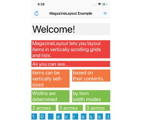 MagazineLayout is a UICollectionViewLayout subclass for laying out vertically scrolling grids and lists of items. Compared to UICollectionViewFlowLayout, MagazineLayout supports many additional features: