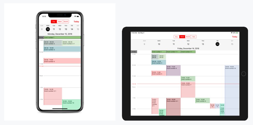 KVKCalendar is a most fully customization calendar library. Library consists of four modules for displaying various types of calendar (day, week, month, year). You can choose any module or use all. It is designed based on a standard iOS calendar, but with additional features. Timeline displays the schedule for the day and week.