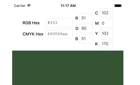 A simple UIColor library to get UIColor object from RGB hex string/value, CMYK hex string/value or CMYK base component values. You can also retrieve back RGB hex string/value, CMYK hex string/value.