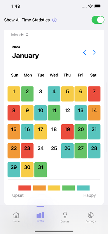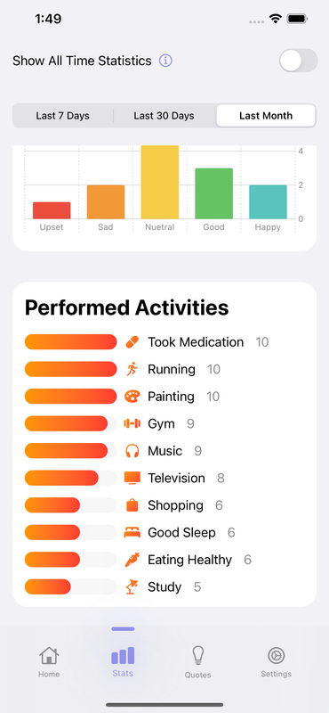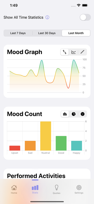 - Statistics – Users can reflect on their information such as activities, moods and daily challenges completed throughout their history using the app.