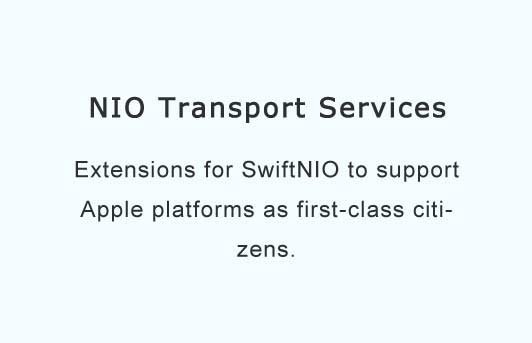 NIO Transport Services is an extension to SwiftNIO that provides first-class support for Apple platforms by using Network.framework to provide network connectivity, and Dispatch to provide concurrency. NIOTS provides an alternative EventLoop, EventLoopGroup, and several alternative Channels and Bootstraps.