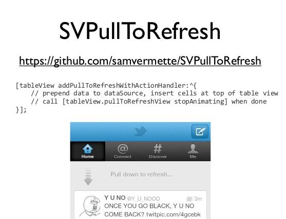 SVPullToRefresh/SVPullToRefreshfolder into your project. - Add the QuartzCore framework to your project.