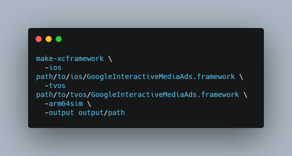 make-xcframework:make-xcframework \ -ios path/to/ios/GoogleInteractiveMediaAds.framework \ -tvos path/to/tvos/GoogleInteractiveMediaAds.framework \ -arm64sim \ -output output/path -