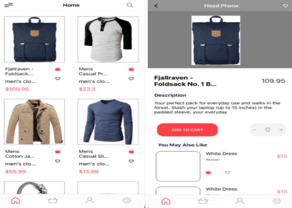 Store app views products, cart, and using login from https://fakestoreapi.com/docs API data.