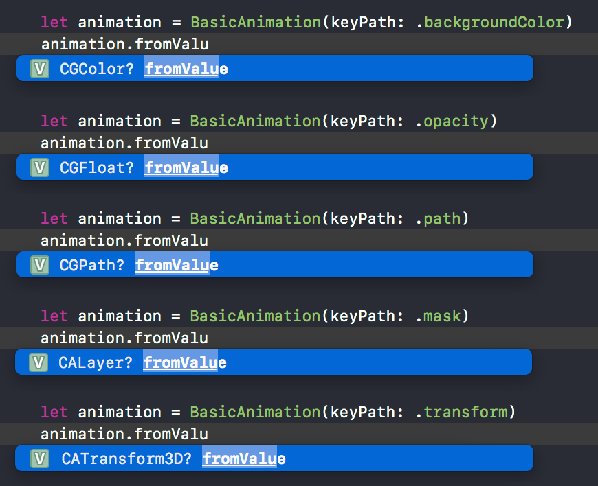 For example, if you want to animate backgroundColor with CABasicAnimation, you need to consider type because fromValue property and so on are Any?.