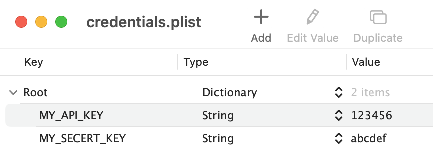 Then you run this script. This script reads credentials.plist and produce Credentials.swift which can be added to