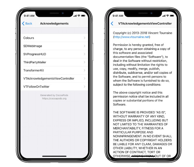 Written in Swift 4.2 (for Objective-C, you can use VTAcknowledgementsViewController).